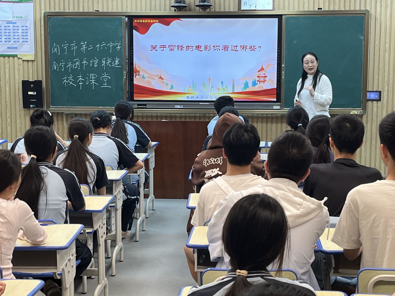 活动当天,南宁市二十六中学(五象校区)内洋溢着浓厚的文化氛围。首先,由南宁市图书馆馆员组成的文化志愿者在校园内搭建起了“绿城展廊”,通过专题展板展示了雷锋年谱暨雷锋主题图书推荐展。师生们驻足观看,通过梳理雷锋年谱,回顾了雷锋平凡而又伟大的一生。