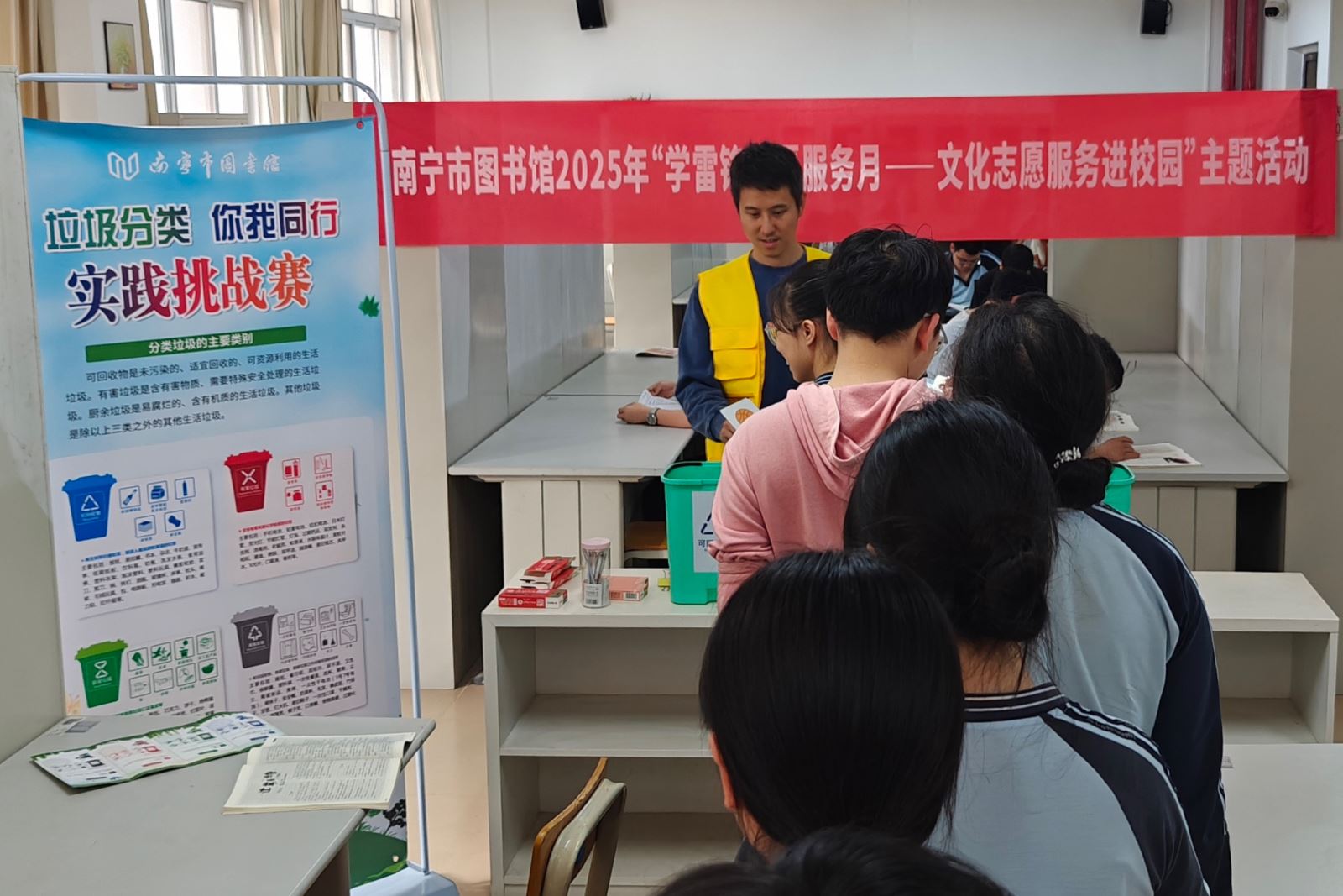在垃圾分类实践挑战赛中,南宁市图书馆物业和安全管理部的垃圾分类督导员志愿者们通过发放垃圾分类宣传手册、开展有奖问答等形式,向师生们科普了垃圾分类的重要性、分类标准以及投放方法。这场挑战赛不仅增强了师生们的环保意识,还以“红色力量”推动了“绿色新风尚”在校园内的普及。