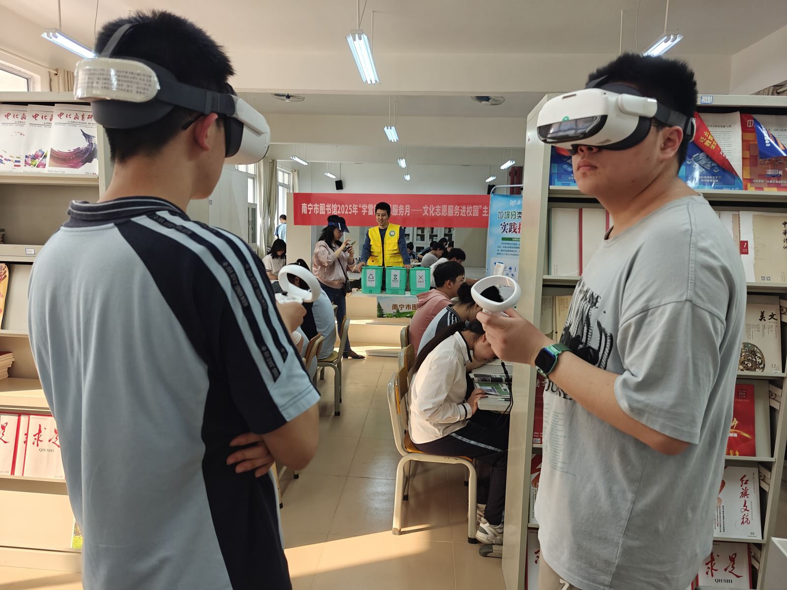 此外,科技赋能未成年人阅读推广也是此次活动的一大亮点。南宁市图书馆馆员志愿者们携带VR虚拟阅读设备,为师生们带来了沉浸式阅读新体验。个性化场景的选择让阅读如临其境,师生们在享受知识与科技有效融合的同时,也感受到了阅读的乐趣与魅力。
