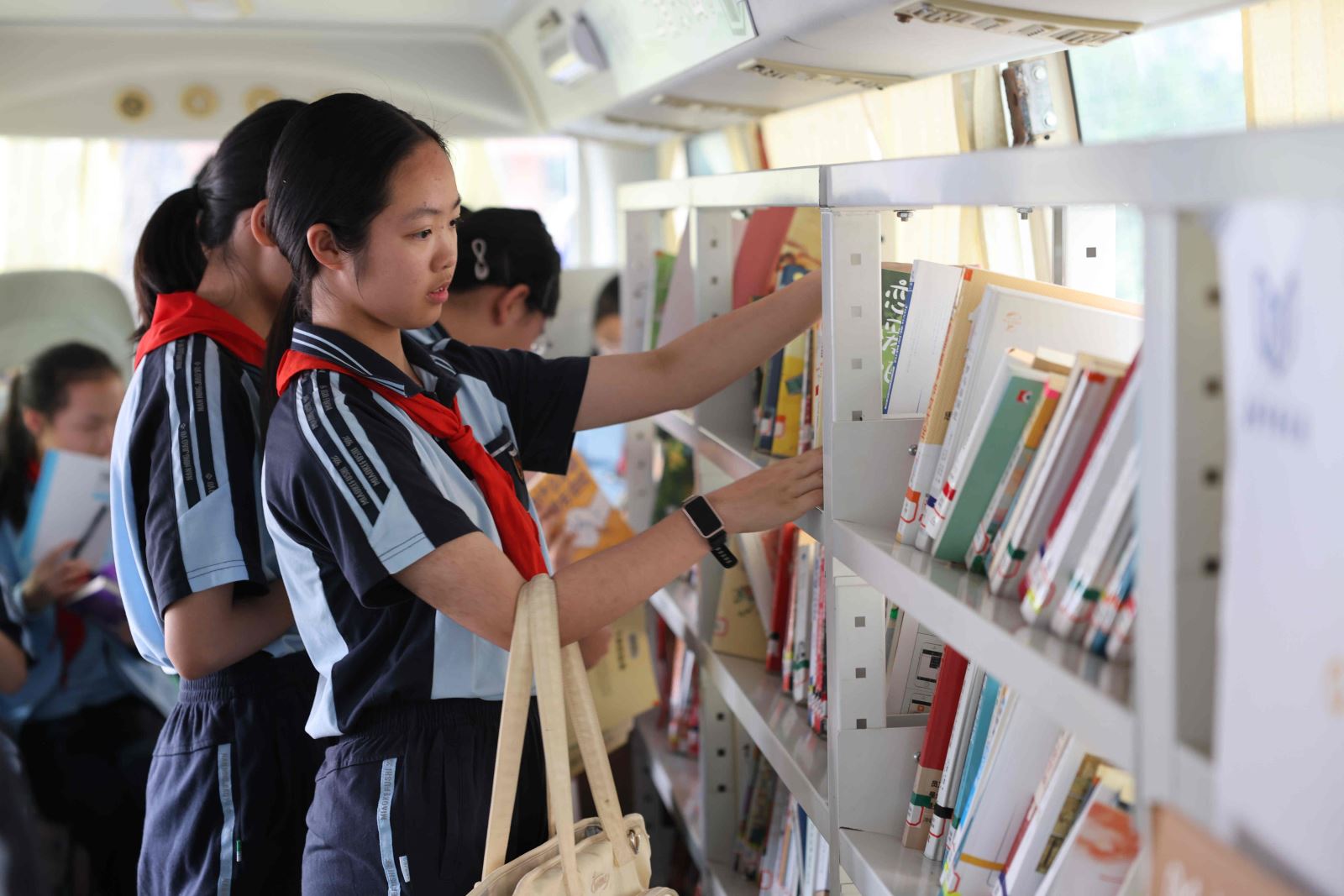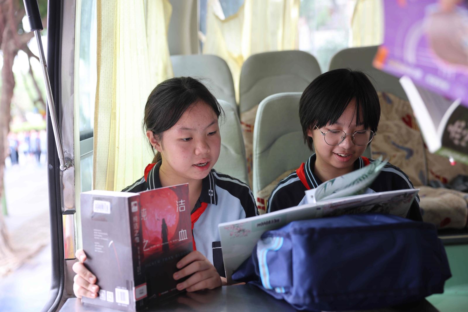 4月29日下午,“走读巴士”继续开进南宁市三美学校,与同学们共享阅读盛宴。在南宁市图书馆文化志愿服务队的引导下,大家按秩序走上大巴,驻足书架前浏览书目,并选取感兴趣的书籍入座阅读。期间看到有意思的片段,同学们都积极与身旁好友分享,整个车厢弥漫着浓厚的阅读氛围。