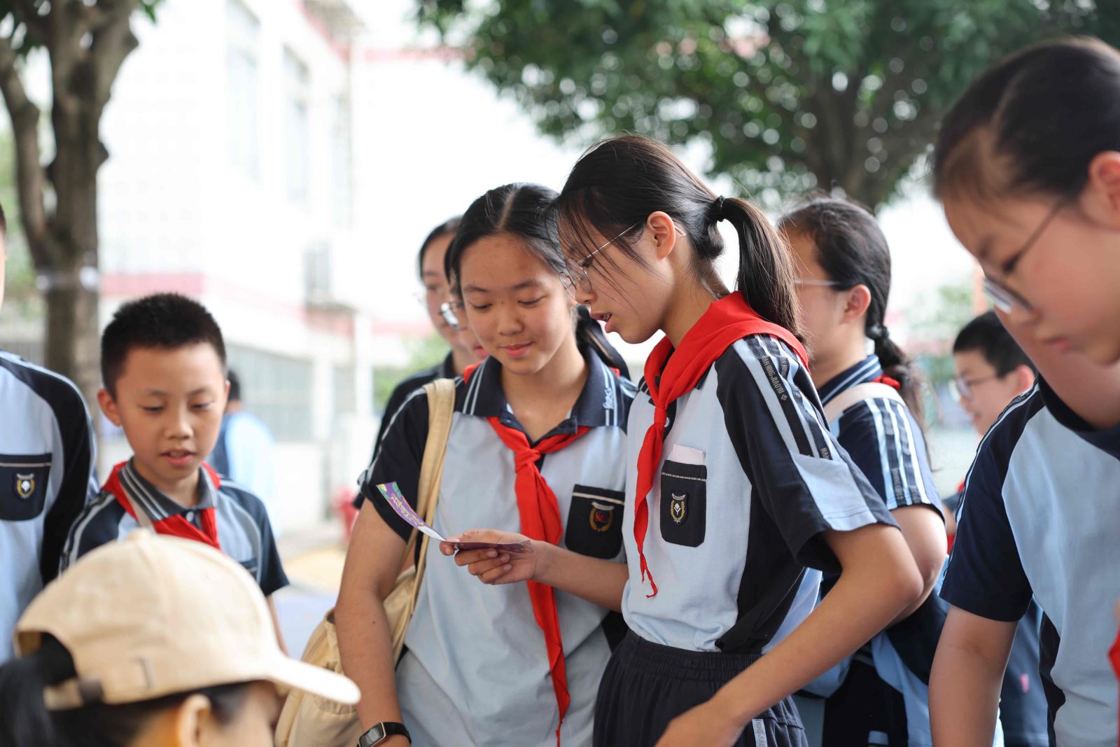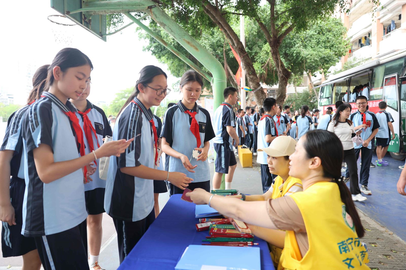 在大巴旁,志愿服务队的老师们还准备了VR虚拟阅读体验,现场的同学对这些新奇设备表现出浓厚兴趣,即便排着长队也要争相体验,体验结束后还与排队中的同学分享感受,勾起大家强烈的好奇心。另一群同学则是对树荫下的灯谜知识有奖竞答更感兴趣,他们领取谜面后迅速进行头脑风暴,抽到高难度题目的同学也不甘示弱,积极请教身边的同学,直到对出正确答案后才露出满意的微笑。