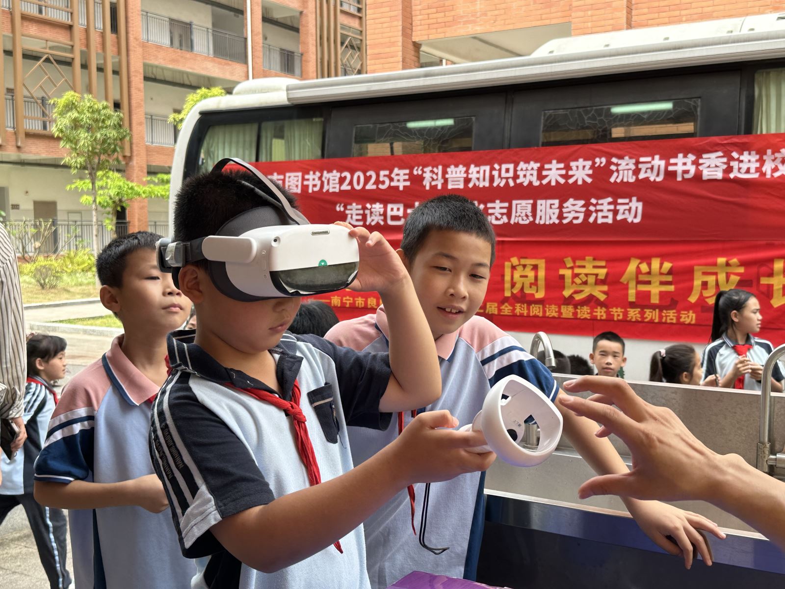 5月15日上午,首场活动在良庆区良玉小学拉开帷幕。流动图书车缓缓驶入校园,宛如一座移动的知识宝库。在老师的组织下,学生们分批有序地登上图书车,挑选自己心仪的书籍,沉浸在书的世界里,享受汽车图书馆阅读服务带来的便捷与乐趣。与此同时, VR虚拟阅读体验活动正如火如荼地进行着。文化志愿服务队的老师们耐心指导,学生们戴上VR设备,仿佛置身于一个全新的阅读空间,这种新奇的体验让他们惊叹不已,也激发了他们对阅读的浓厚兴趣。