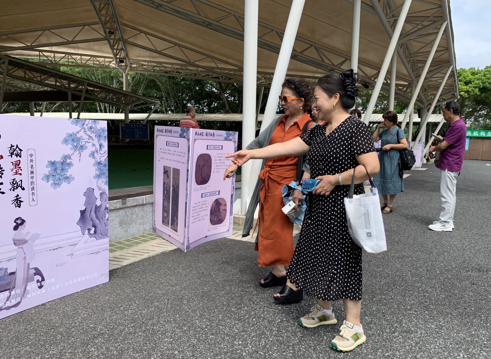 “猜歌名”有奖答题区域,一首首经典歌曲的歌谜吸引着师生们的目光。大家或跟着歌词哼唱,或相互讨论,努力猜出歌名,现场充满了欢声笑语。同时,“绿城展廊|书画传家 翰墨飘香——中外名画中的读书人”专题展也在校园内开展,文化志愿服务队携带的专题展板,为师生们带来了一场视觉与知识的盛宴,让大家在欣赏名画的同时,也感受到了阅读的魅力。