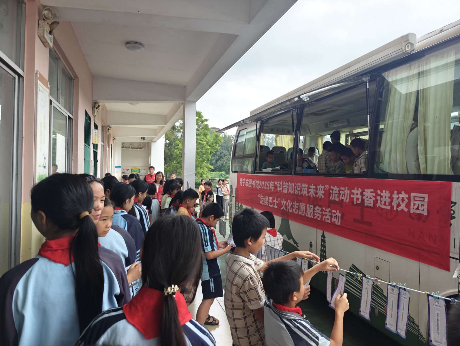 为积极响应国家“科教兴国”战略,大力普及前沿科技知识,全力培养大众的创新思维与实践能力,2025年全国第二十五个科技活动周期间,南宁市图书馆阅读推广部精心策划并开展了“科普知识筑未来”流动书香进校园“走读巴士”文化志愿服务活动。此次活动如同一阵清风,为多所学校带来了知识的芬芳与科技的魅力。