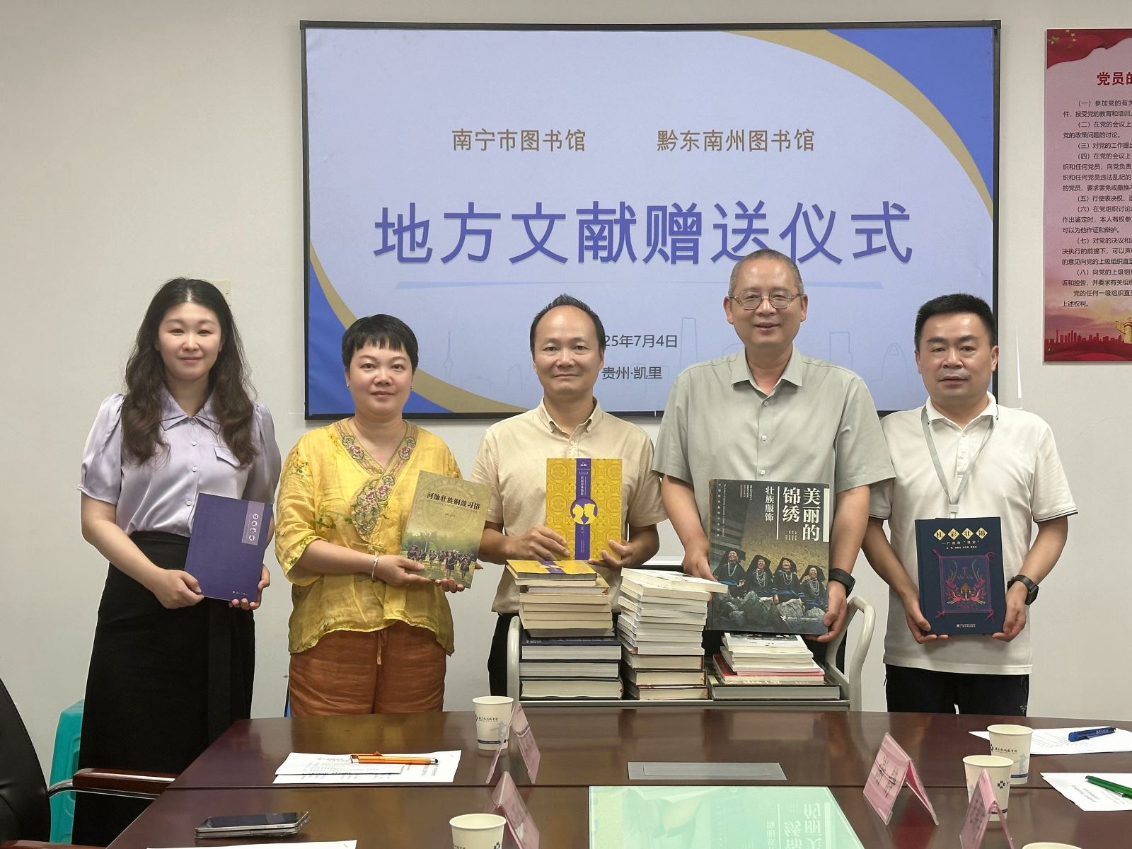 4日下午,双方在黔东南州图书馆开展文化交流座谈会,通过对民族文献数字化、古籍保护等议题的探讨,推动资源共建共享。两馆也在从中达成了共识:从壮乡绿城到苗岭侗寨,我们既是文化的探访者,更是文明的对话者。图书馆应当成为促进各民族交往交流交融的“文化驿站”。在文献互赠环节,南宁市图书馆赠送的《锦绣广西》《壮族经典情歌》《美丽的锦绣·壮族服饰》等20种地方文献,与黔东南州图书馆回赠的《黔东南非物质文化遗产集锦》《侗族大歌志》《苗族银饰研究》相映生辉,既丰富了馆藏,更搭建起跨越山水的“文化数据库”。