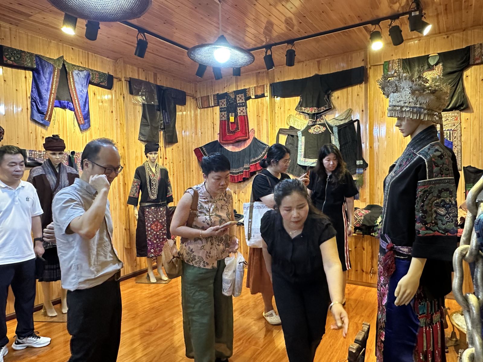 7月3日,南宁市图书馆交流团首站抵达“天下苗族第一县”台江县。在台江县非遗展示馆,百余件苗族银饰、剪纸、泥哨等非遗展品令人叹为观止。走进苗绣非遗工坊,织布机上的苗锦仿佛正以“通经断纬”技法编织着古老传说,交流团成员仔细端详一件件精美绝伦的苗绣服饰,投入地与非遗传承人探讨壮锦与苗锦的工艺异同。民族刺绣博物馆内,从清代破线绣到现代创新纹样,每一幅绣片都仿佛无字的史书,其中珍藏的“蝴蝶妈妈”等传统纹样,生动再现了苗族创世史诗的瑰丽想象。