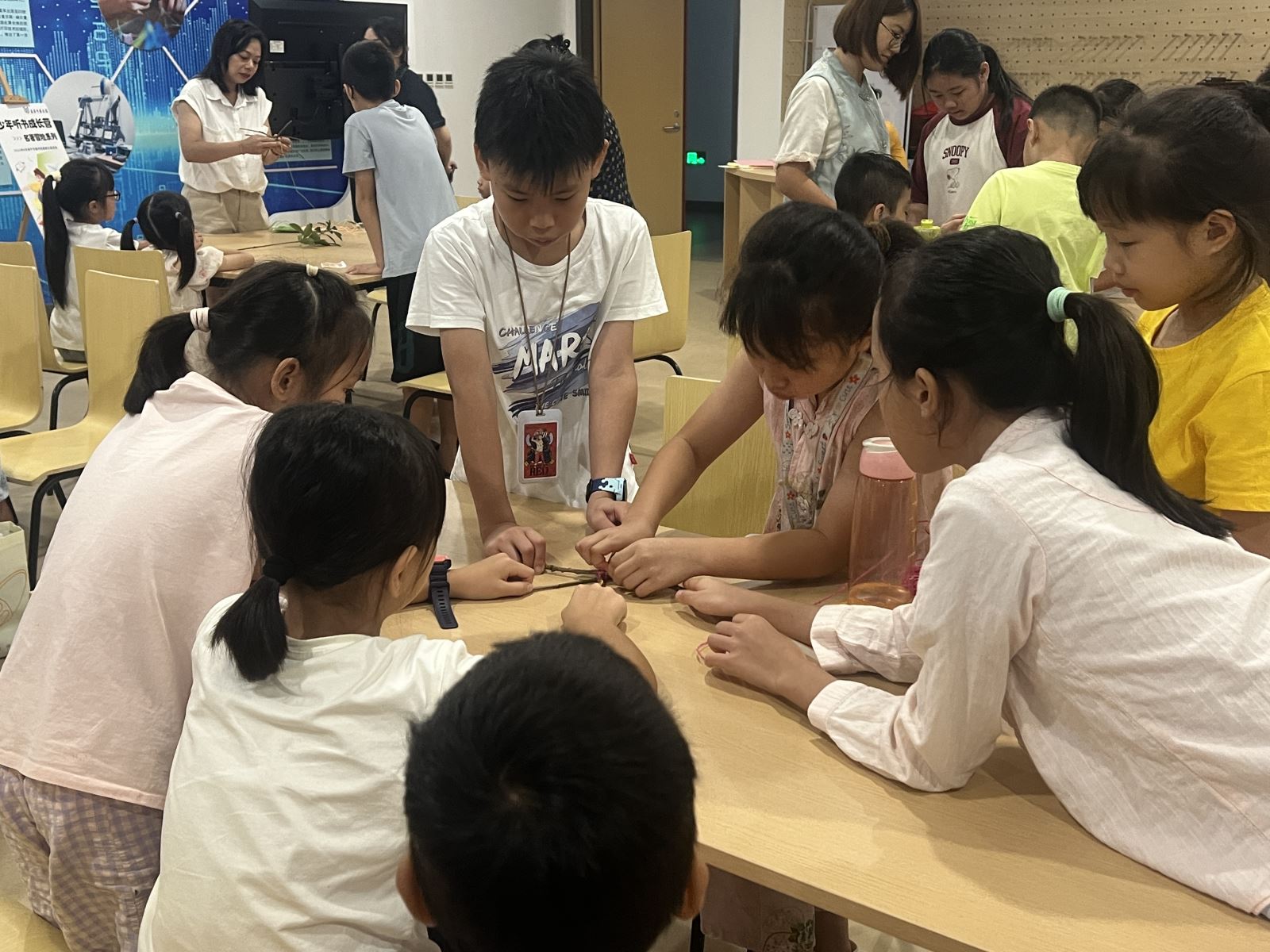 8月6日上午,创客空间内洋溢着孩子们的欢声笑语。首期活动以经典童话《夏洛的网》为主题,通过沉浸式听书、悬念领读和趣味闯关,引导孩子们思考友谊的真谛。在“蛛网密码卡”环节,孩子们将夏洛织网的文字翻译成“友谊暗号”,他们认真讨论、热烈交流,用稚嫩的笔迹写下对友谊的理解。最令人惊叹的是3D蛛网制作环节,各组小队员分工合作,用彩色丝线在特制框架上编织出立体蛛网模型。“要织得结实些,这样才能救威尔伯!”一位扎着马尾辫的女孩边织边叮嘱同伴。最后的“友谊电台”环节将活动推向高潮,孩子们轮流化身电台主播,用充满童真的语言播报夏洛留给威尔伯的最后留言,发自内心的话语让不少家长在旁听得回味无穷。