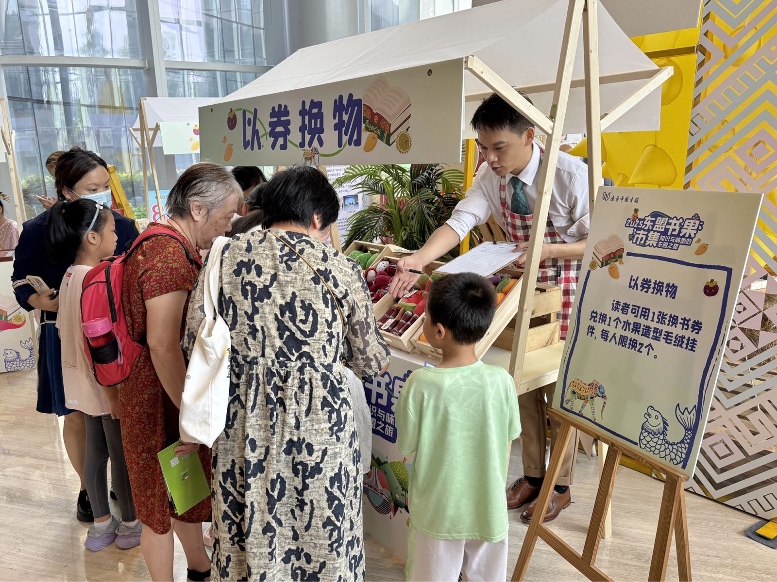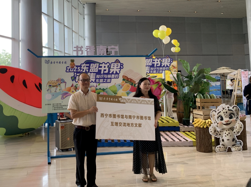 在“一带一路”倡议深入推进与RCEP区域合作全面生效的背景下,2025年9月20日,南宁市图书馆在一楼城市客厅创新推出东盟“书”果市集文化交流活动。本次活动以“书香邕城·果韵东盟”为主题,以“书籍+水果+蔬菜”为媒介,融合旧书换新、文创展示、非遗体验、知识共享等形式,为市民读者带来了一场兼具烟火气与国际范的文化盛宴,生动诠释了“一带一路”倡议下文明互鉴的深厚内涵。