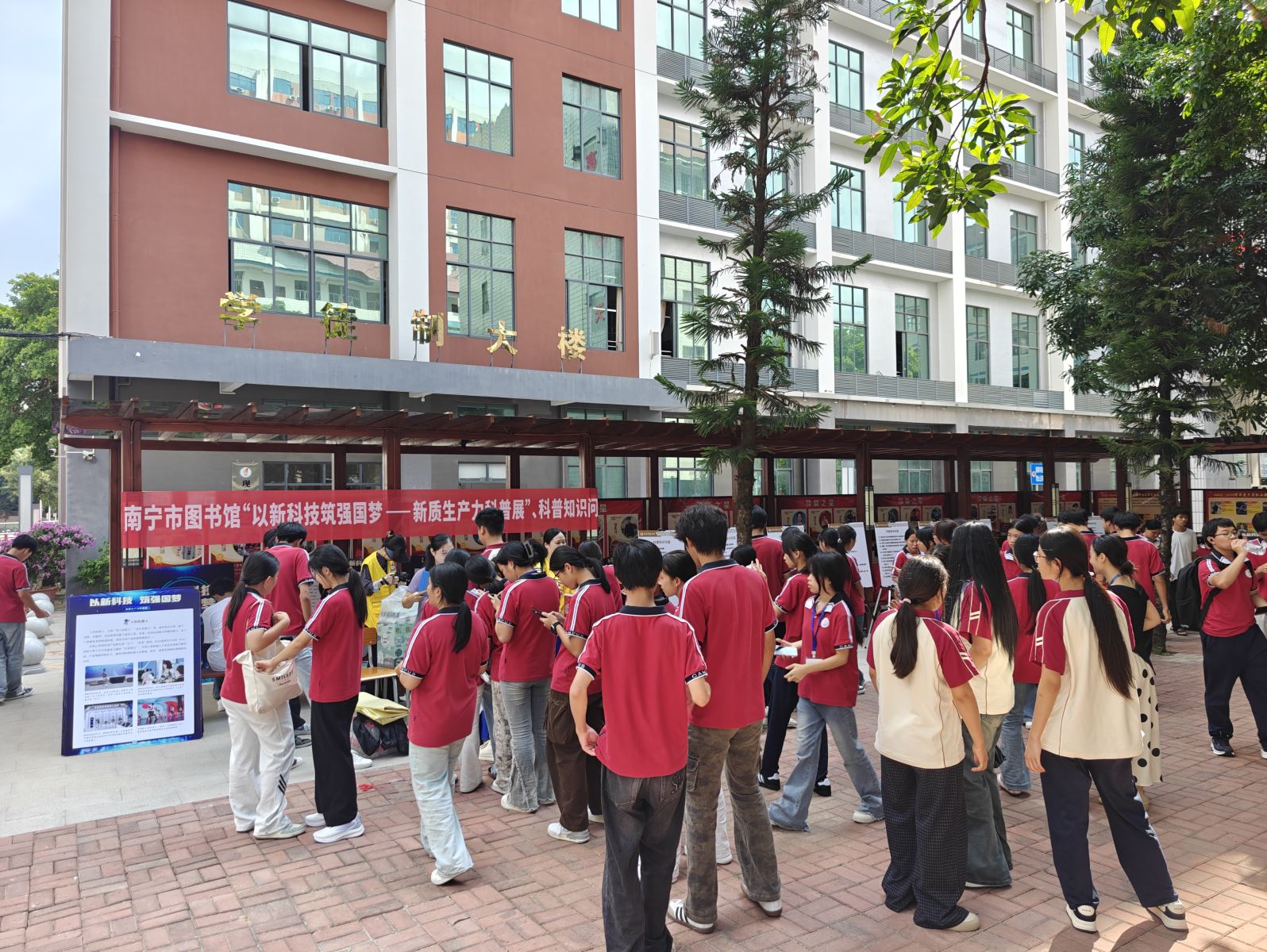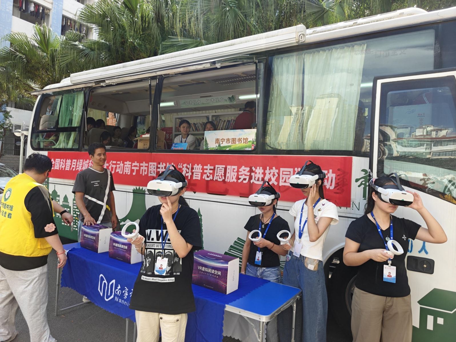 为深入贯彻全国科技大会精神,积极响应南宁市“首个全国科普月绿城科普大行动”号召,2025年9月23日下午,南宁市图书馆文化志愿服务队走进广西工业技师学院,开展内容丰富、形式新颖的“科普志愿服务进校园”活动。活动通过流动图书车阅览、VR虚拟阅读体验、专家主题讲座、科普专题展览及科普知识问答等多种形式,为全校师生带来了一场别开生面的科普盛宴,有效激发了青少年的学习热情,营造了崇尚科学的浓厚校园氛围。