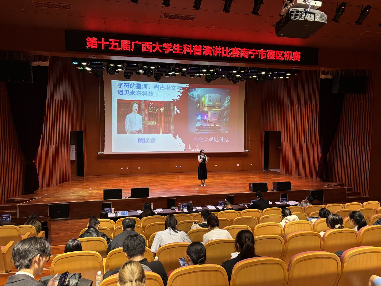 为深入贯彻落实《广西科技创新“十四五”规划》精神,激发大学生科技创新热情,由南宁市文化广电和旅游局、南宁市科学技术协会、共青团南宁市委员会联合主办,南宁市图书馆承办的“第十五届广西大学生科普演讲比赛南宁市赛区初赛”于2025年12月12日在南宁市图书馆成功举办。本次赛事以“AI赋能未来:探索·创新·责任”为主题,吸引21所驻邕高校39名选手同台竞技,展现了当代青年对科技发展的深刻思考与青春担当,最终选拔12名优胜者晋级自治区决赛。