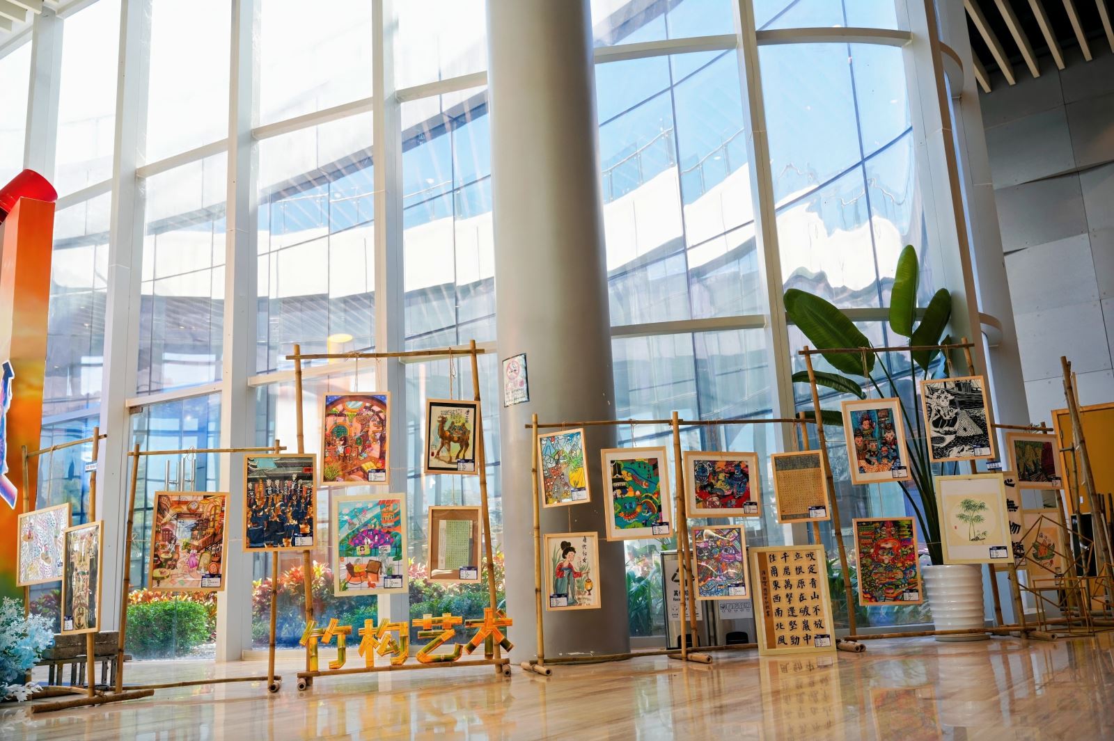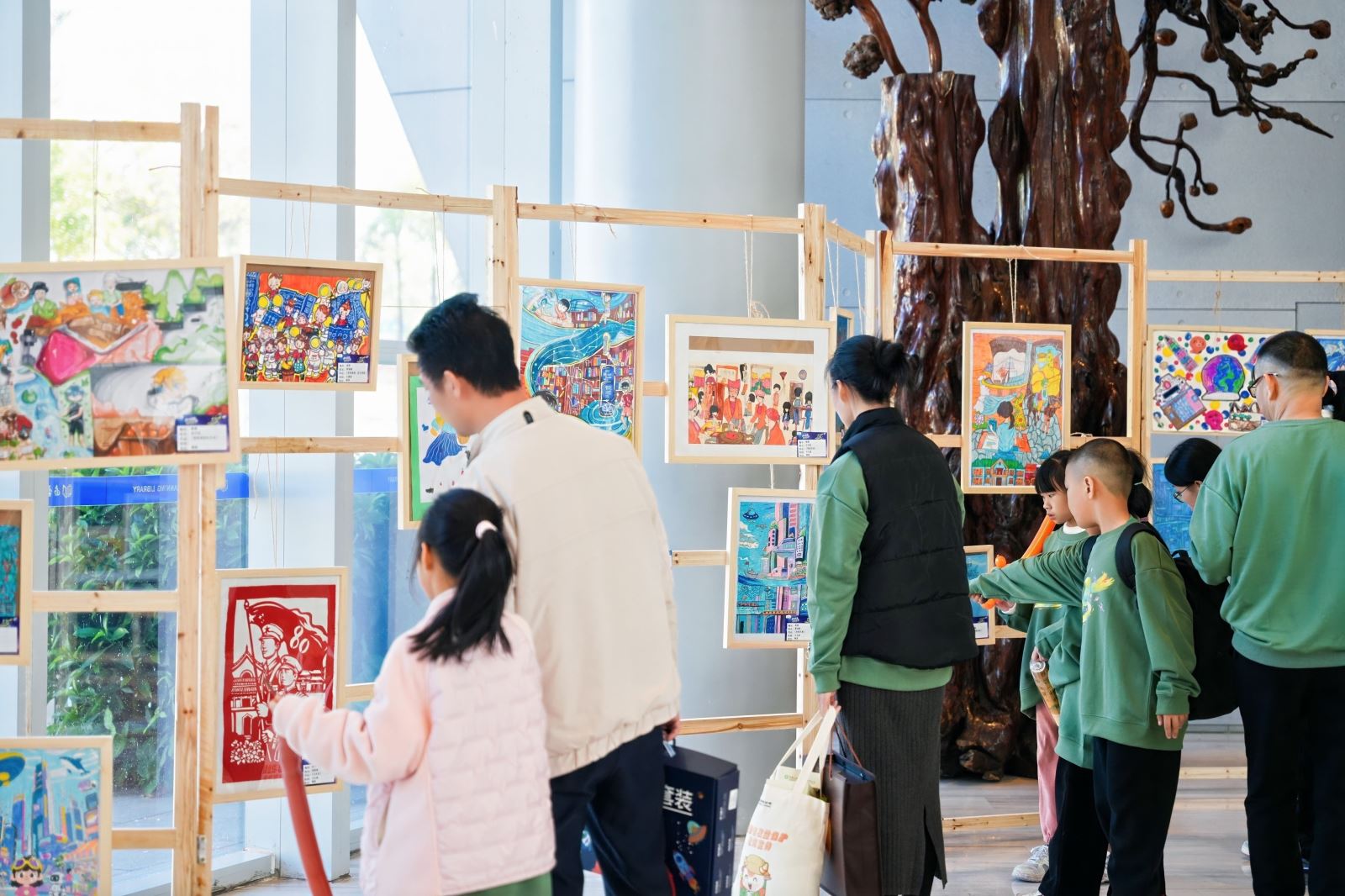 2025年11月29日画展正式在南宁市图书馆拉开帷幕,展览围绕“星际冒险、梦想剧场、未来万象、时光穿梭”四大主题,展出了350幅优秀作品。本次活动特别注重互动体验与沉浸氛围的营造。启动仪式当天,馆内设置了非遗美育课堂,孩子们在老师带领下亲手体验壮锦编织技艺,感受传统文化魅力;妙趣横生的魔术表演吸引众多家庭驻足互动,欢声笑语不断;展区以“竹”为元素进行布置,童趣画作与馆内藏书相映成趣,营造出“书香与画意交融”的观展空间。