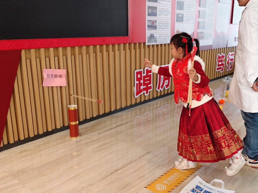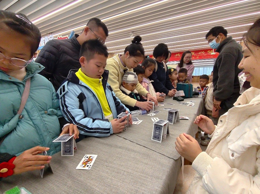 投壶、套圈等传统民俗游戏在图书馆内焕发新生机。“游园投壶赢新年礼物”区,参与者屏息凝神,将箭矢投入壶中,引来阵阵喝彩;“游园套圈赢新年礼物”区,读者们瞄准目标,精准投掷,成功套中礼物的欢呼声此起彼伏。此外,“纸牌搭高塔赢新年礼物”环节吸引众多家庭组队挑战,孩子们与家长默契配合,用纸牌搭建出形态各异的高塔,既锻炼了动手能力,又增进了亲子互动。
