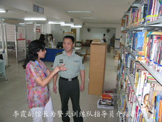 2010年6月4日上午,南宁市图书馆李霞副馆长接待了广西军区警犬训练队的官兵,并根据战士们的兴趣爱好及军事专业,为他们挑选了600多册图书及音像资料,为新增设的广西军区警犬训练队图书流通站送去了一份浓浓的书香。据悉,该流通站每半年更换一批新的图书,战士们可以了解到更新、更全的资讯和信息,从而更与时俱进的为党和人民服务。