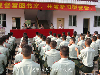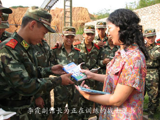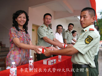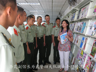 当天下午,南宁市图书馆又迎来了一批身着绿军装的特别读者。他们是武警四大队某中队的官兵。李霞副馆长详细的为他们介绍了市民阅读中心、各借阅室以及借阅流程。随后,李霞副馆长率南宁市图书馆的员工来到该中队警营,为正在训练场训练的战士们送去2000多册图书,并举行了“援建警营图书室,共建学习型警营”的赠书仪式,受到了武警战士们的热烈欢迎。