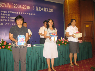 8月10日上午,在明园新都酒店举行的《广西北部湾经济开放开发报告(2006-2010)》首发仪式上,我馆副馆长李霞代表南宁市图书馆上台接受赠书。