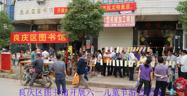 依托南宁市开展2012年度“书香绿城”活动之际,良庆区图书馆举行庆“六一”游艺活动。“六一”节当天在图书馆门前举行知识竞猜、抛沙包等群众喜闻乐见的游艺活动,在电子阅览室利用国家配送的投影播放动画片及爱国影片,指导未成年人健康上网。良庆区图书馆近期开展的各种宣传活动活动,吸引了大批的群众到图书馆阅读,不仅充分发挥公共图书馆保障公民基本文化权益的阵地作用,更使广大公众特别是青少年、进城务工人员等群体进一步了解公共图书馆免费开放的内容,充分利用公共图书馆的资源,让居民都参与到全民阅读活动中来。