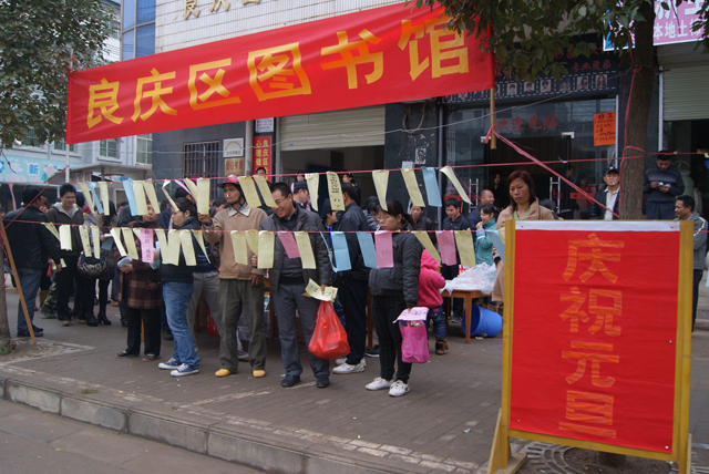 12月28日上午,良庆区图书馆在馆大门口开展“庆元旦 迎新年”读者游艺活动,约350多名读者及附近居民分别参加有奖知识竞猜、猜谜语、抛沙包、滑台滑等活动。据悉, 2012年该图书馆分别举办计算机知识培训班、经典国学诵读启蒙培训班、感恩主题报告等活动,内容丰富,形式多样,非常受到读者的欢迎。