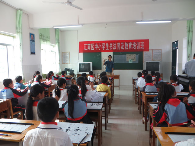 培训班上,老师就中国书法简史介绍、写字指导、字帖临摹、书法作品欣赏等内容,有针对性地对学生进行了讲解和培训。通过师生问答、学生上台演示等互动交流方式,让学生在轻松、欢快的氛围中学习书法知识。课堂上笑声连连、掌声不断,授课的内容和方式得到培训学校师生的一致好评和肯定,纷纷表示希望这样的培训能长期举办,有利于学生更进一步地了解和学习书法。江南区图书馆给参与培训的每位学生都发放了硬笔书法字帖、练习本和笔等基本的书法学习资料。图书馆黄馆长表示,今后将根据辖区内中小学生的需要,继续举办青少年书法普及教育培训班,让更多的青少年参与到书法普及教育中来,让他们了解书法、学习书法、热爱书法。目前,启笔书画教育培训机构已与杨村小学达成教学协议,今后每个月书法老师将义务为学生开展两三次硬笔、毛笔书法培训。