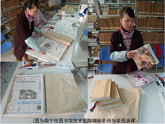 为继续深入推进南宁市城乡一体化联合图书馆建设,保证南宁市公共图书馆联合服务的顺利进行。 12月24日,在南宁市图书馆学会的指导下,由南宁市图书馆的技术部陈啸秋老师为江南图书馆的管理员们分别就期刊和报纸的财产登记、分类编目、整理加工、排架、借阅服务等一系列内容进行现场培训, 同时通过其它图书馆的工作事例,指导学员开展现刊外借,过刊报纸装订的方式方法。老师深入浅出的讲解与耐心细致的现场演示使学员们受益匪浅。学员们纷纷表示,“通过这次培训,提高了认识,理清了思路,学到了新的管理技术,找到了自身的差距和不足。希望今后能多参加图书馆管理方面的培训班,继续加深了自身业务素质和工作技能方面的知识,提高了实际操作能力,增强责任意识、服务意识,从而更好的服务广大读者。