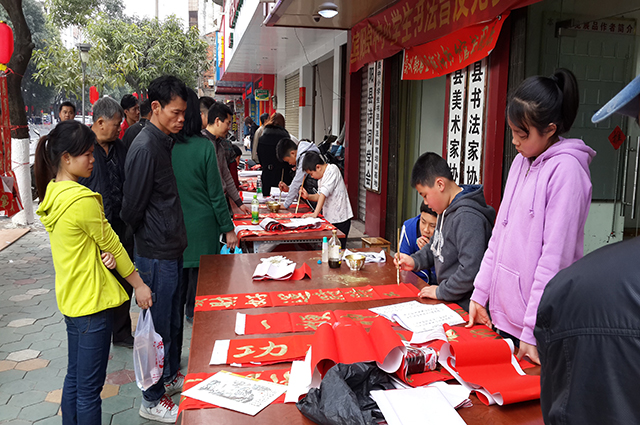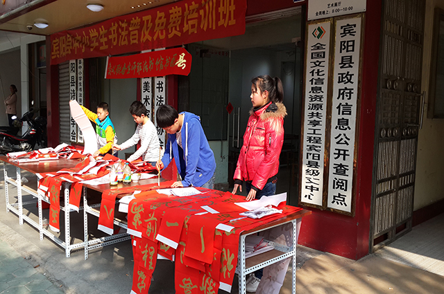 宾阳县图书馆还注重发挥文化宣传阵地的作用,2014年春节期间举行了新春对联义卖活动。既展示了本馆“翰墨凝香笔生辉•中小学生书法普及教育免费培训活动”的成果,也提升了春节文化活动氛围。据不完全统计,整个活动义卖出新春对联400多幅(对)。