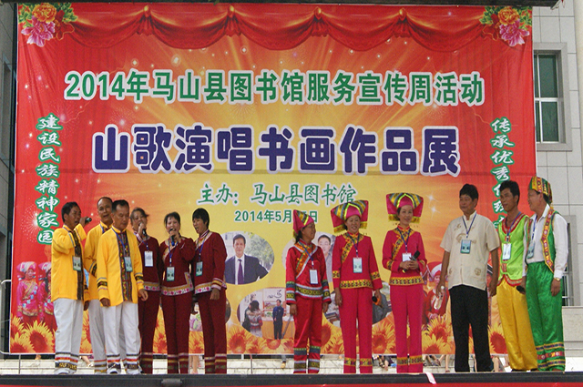 5月25日上午,马山县图书馆在县人民广场举行“2014年全国公共图书馆服务宣传周”活动。此次活动以“图书馆——承传优秀传统文化,建设民族精神家园”为主题,推出山歌对唱、歌舞表演、书画作品展览等一系列形式多样、丰富多彩的广场文化宣传活动。