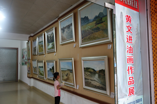 本次展出的50幅油画作品均来自武鸣中学的黄文进老师,他自1981年开始从事初中、高中的美术课教学,三十五个春秋,孜孜不倦于美术教育,数度领甲,承载着文化艺术的传承与发展,如今硕果累累,桃李遍天下。此次展览作品是黄文进老师对祖国美丽山河、魅力壮乡武鸣的艺术展现,主要以景物描绘居多,如《金色田园》、《林中小溪》、《迎着朝阳》、《武鸣起凤山小河》等。其风格清新高雅,刻画细腻精湛,既富有壮民族的传统底蕴,又洋溢着新时代鲜活的气息,吸引众多喜爱书法、绘画的群众前来参观。值此国庆佳节来临之际,为武鸣县人民献上一道别具一格的视觉盛宴,也为书画爱好者提供一个艺术交流学习的平台。在展览现场,参观者亲切交流、相互探讨,对黄文进老师的赤诚之心和绘画水平赞不绝口。