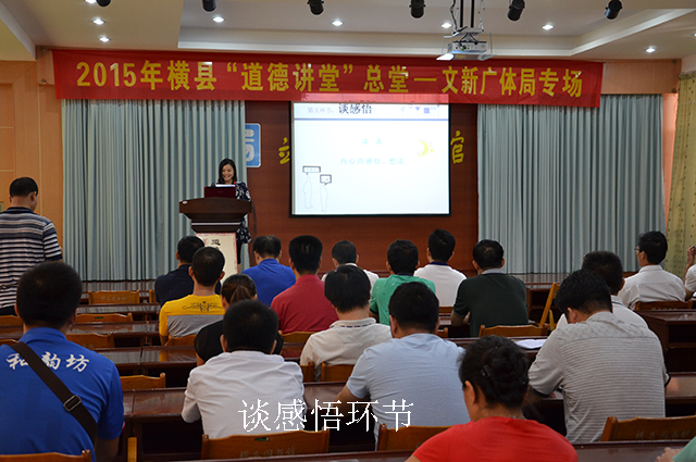 本次道德讲堂以“爱岗敬业”为主题。主持人雷璇以《礼记》中敬业乐群之语拉开活动的序幕。在随后的唱一首歌环节,活动现场的气氛也变得热烈起来。在观看短片《走基层:“抗艾先锋”杜丽群》时,大家完全被杜丽群抗艾先锋故事所感动,整个会场鸦雀无声。接着由横县博物馆小范讲述身边好人——横县博物馆原馆长孙冬梅同志的故事,县博物馆在孙冬梅馆长带领下,成为爱国主义教育基地、成为南宁市、自治区远近闻名的一所县级博物馆。孙冬梅尽心尽责、无私奉献的故事深深感动了与会听众。感受道德力量后,现场干部职工和读者都谈一番感悟,纷纷发表自己的看法和观点,并表示“爱岗敬业就是要用实际行动来专研业务,敢于担当重任”。活动最后,由主持人引领大家诵读范仲淹《岳阳楼记》名句:“先天下之忧而忧,后天下之乐而乐!”结束了道德讲堂活动。