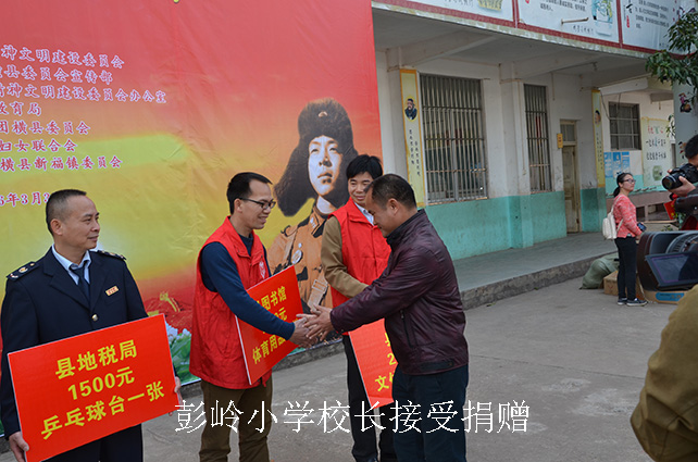今年的全县"学雷锋结对帮扶"活动在横县新福镇彭岭小学广场隆重举行,上午10点,由县委宣传部副部长、县文明办主任零余君宣布活动正式开始,县内16个区市文明单位参加了此次活动。其中横县图书馆与横县新福镇彭岭小学结对子,由县图书馆王遇璐馆长率图书馆志愿者服务队一行,给彭岭小学500多名师生带去了1500元体育用品一批。