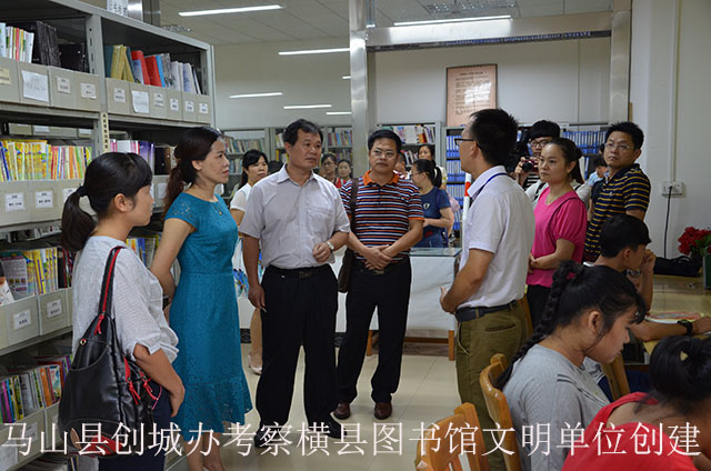 7月1日,马山创城办考察团一行27人到横县图书馆考察学习文明单位创建工作经验。在横县县委常委、县委宣传部部长、副县长黄冬丽的陪同下,马山创城办考察团先后考察了横县图书馆的公共电子阅览室、少年儿童借阅室、读者活动中心、多媒体报告厅和综合外借室。考察团一致认为,横县图书馆场馆优雅,干净整洁,文明单位创建氛围浓厚,不论场所布置还是服务窗口工作人员,都展示出文明单位的精神面貌。