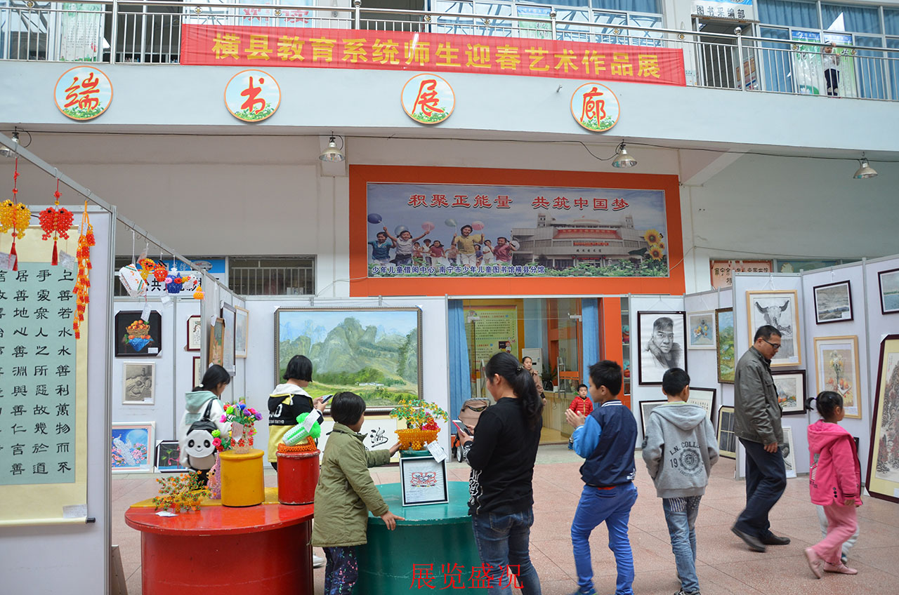 春意盎然,翰墨飞扬!由横县教育局主办、横县端书图书馆协办的横县师生艺术作品迎春展如期在图书馆展出,共计600多幅(件)精美艺术作品,预计展期为1个月,得到全县城乡读者热烈欢迎。为响应广大读者的强烈要求,展期一再延期至今,已有近万名读者进馆参观。教育局负责人反映,今年要先安排优秀作品晋邕参加迎春展,展览在自治区博物馆展出,充分展示了横县师生艺术创作新风貌、新水平。