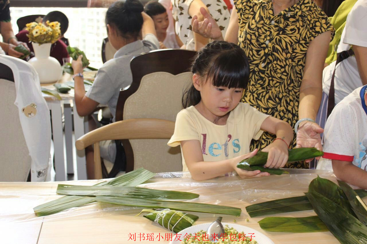 第二个环节“体验端午”开始之际,孩子们早已跃跃欲试,一个个摩拳擦掌。对他们来说,包粽子的过程远比吃粽子要好玩一百倍。在依次领好图书馆事先为大家准备好的粽叶、糯米、肉馅、绿豆及包粽子所需要的盆、线、剪刀等必须用品后,这场别开生面的包粽子活动就开始了。随着一声“开始!”,参加包粽子活动的各个家庭顿时忙碌起来。大家在图书馆包粽子老师的专业指导下卷粽叶、放糯米、捆扎,粽叶在各个家庭成员的手中上下翻舞。8岁的刘书瑶小朋友今天也来学包粽子,折叶,放馅,压住捆线,有模有样,看到成形的粽子开心不已,“妈妈,看!这是我包的粽子,真好玩!以后我们还要来参加图书馆的活动。”