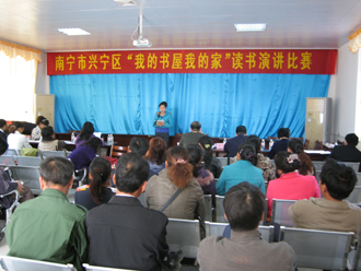4月2日上午,从兴宁区五塘镇政府会议室传来阵阵热烈的掌声和欢呼声,2010年南宁市兴宁区图书馆“我的书屋我的家”演讲比赛在这里拉开了帷幕。我馆的副馆长李霞、活动部主任全维明作为评委参加了这次活动。16位来自兴宁区所辖社区(村)的参赛选手角逐本次比赛的一二三等奖。南宁市文化新闻出版局副局长李华汉、兴宁区文化和体育局副局长班欣荣亲临现场,为选手们助威。