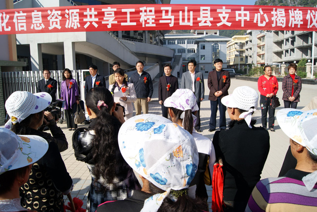 参加揭牌仪式的领导和嘉宾在县图书馆参观了文化信息资源共享工程马山支中心主控机房、电子阅览室,他们对该中心前期建设工作予以充分肯定,并对今后工作提出了具体要求和殷切希望。他们指出:文化信息资源共享工程是一项文化创新工程,是民心工程,它对提升县级图书馆的管理工作,对改变图书馆的服务模式具有重要的意义,对传播科学知识,先进文化、引导农民群众脱贫致富、丰富和活跃基层文化生活起巨大的推动作用。要加强共享资源的宣传工作,让学校、科研机关、读者等了解,让全县人民了解,真正发挥共享资源的作用;要以共享工程为依托,加强导读咨询工作,改变借借还还的局面,积极主动参考咨询服务,为全县决策服务,为经济服务,为普通读者服务;要进一步收藏、征集地方文献资源,提升服务能力。