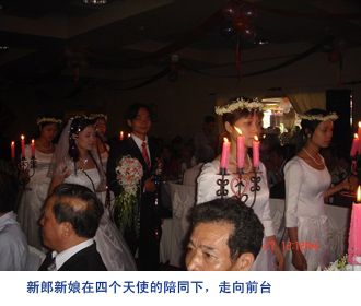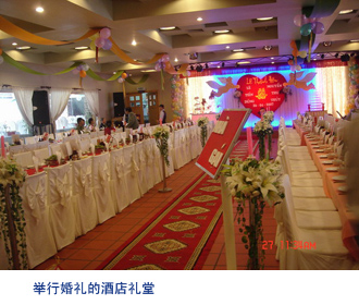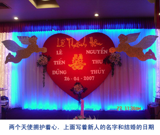 现在的越南人喜欢将婚宴设在星级宾馆。在宾馆的门口,你会看到摆放着两个红色的心形纸盒。一个写着“新娘”,一个写着“新郎”,这两个盒子是想告诉宾客婚宴是由新娘、新郎两家合办的,男女各方的亲朋好友要将礼金分别放入各自的盒子中,最后各归其主。随着“婚礼进行曲”的奏响,新娘、新郎手挽手,在掌声中缓缓迈上红地毯。此时,音乐声、祝福声、欢呼声充满整个宾馆,那种幸福欢乐的氛围不禁让我想起中国的一句古话:只羡鸳鸯不羡仙。