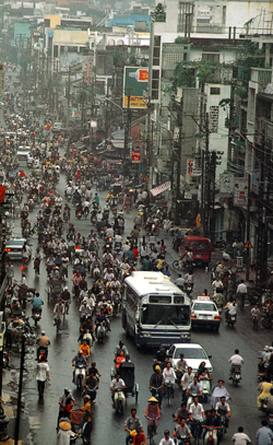 在越南的城市,摩托车的数量之多让人印象深刻,尤其是在胡志明市。白天,大队的摩托车组成的车流蔚为壮观,晚上更是如同一条火龙。摩托车是越南最普遍的交通工具,差不多人手一辆,拥有摩托车并不代表富裕。那里街头大多是轻便摩托车,喷漆色彩绚丽,很漂亮。据越南朋友说,那里的摩托车大多是本国合资企业生产的,其零部件主要来自中国,还有一些源自日本。