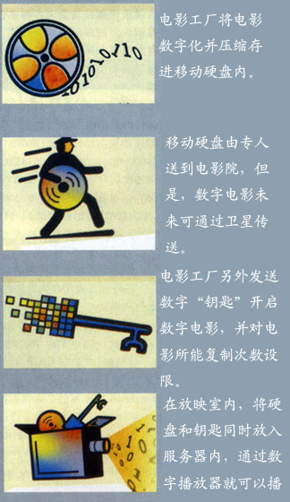 新加坡新达城某家电影院放映室内,放映员把胶片放入放映机,磁带旋转,咔哒咔哒声充斥整个屋子,情况跟其他放映室大同小异。但是一细看,就会发现在5个传统放映机旁都配有新玩意,正发出嗡嗡的声音。这些小玩意就是数字电影放映机,供播放由移动硬盘传输的数字电影。荣华机构有限责任公司董事长、影院老板胡志荣说:“我的放映工人只需要摁几个按钮就能播放一场数字电影,所有的操作比以前简单多了。