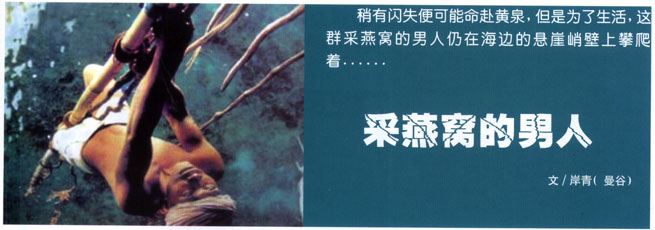 采燕窝时,采集者生命完全依赖脚下所踩的竹子,万一竹身年久腐朽。便可能断送一条人命。因此,他们会先敲打竹竿,如果回声像纸板,就赶快避开;如果声音清脆拙实,便可放心地踩上去。而且,攀藤的藤蔓一次至少要抓住三、四根,决不能只抓一根。
