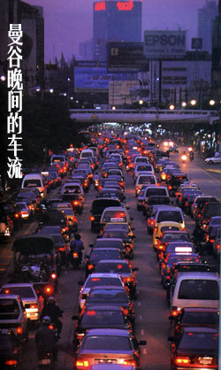 第一次见识泰国道路拥堵是9月9日晚7时许,我们从泰国机场去曼谷 宾馆的途中,时值下班高峰期(泰国时间比北京时间晚一个小时)。道路上挤满如蜗牛般慢行在街道上的小轿车,本来只需25分钟的车程,我们走了将近50分钟。