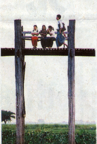 缅甸这座“情人桥”始建于公元1849年,完工于公元1851年,桥身全长达1.2公里。从远处遥望这座桥,你会发现这座桥的总体外形极像汉语中的“之”字,婉蜒盘旋在碧蓝的陶德曼(Taungthaman)湖上。“之”字形的桥身设计,不仅显出了它优美的风姿,而且这样的设计可以减缓雨季时大水对桥身的冲击力,有效地保护桥身的稳固。更让人感到惊叹的是,这座桥全部是采用缅甸本土出产的优质柚木所建,而且这些柚木均来自曼德勒周边的实皆市和阿瓦市拆迁房的废弃顶梁,这不仅赋予了整座大桥浓厚的文化气息,而且从另一个侧面反映出当时缅甸人民已经懂得资源的充分利用。