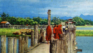 记得第一次去情人桥的时候,心里就产生了一个谜团。因为依照那座桥的名字直接音译应该译为‘吴板(U PEIN)’,但是却不知道当地人为什么给它取了这样一个赋有诗情画意的名一情人桥。”初到情人桥时,小黄认为这座桥肯定是修建者为他心爱的人所建的,因为两个相爱的人分隔两地,长久的思念使得彼此都变得憔悴而瘦弱。而缅甸语中“板(PEIN)”有“瘦弱”的意思,因此小黄便根据字面的意思猜测起情人桥的由来。而朋友听后却摇摇头说,“吴板”就是修建此桥的人。因为这里在旱季低洼处可以积水成湖,甚至乘船,而到雨季湖水上涨时就成了泽国。为了解决人们的出行困难,敏东王决定让吴板来修建这座木桥。为了纪念他,敏东王就下令以他的名字来命名这座桥。后来,很多情侣喜欢在桥上漫步、约会,于是,当地的华人便将它称为“情人桥”。这样“情人桥”便在曼德勒以这样的名字被人们世代地称呼下来。至今曼德勒的青年在定情时还有手挽着手漫步情人桥,祈求爱情美满幸福的风俗。