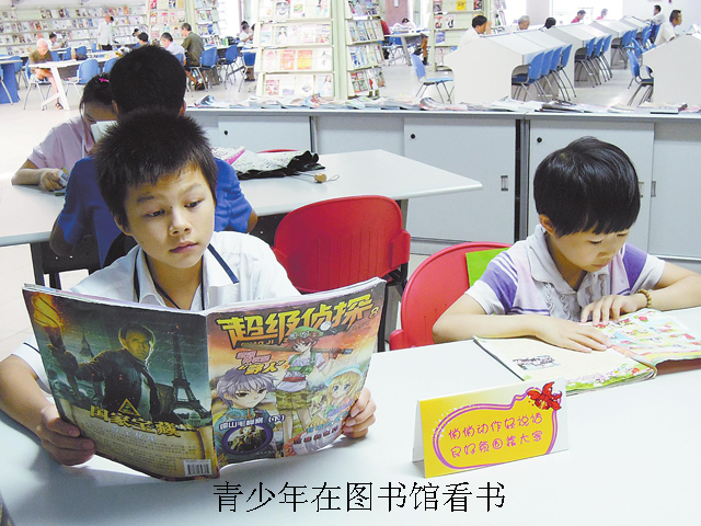 在市图书馆市民阅读中心,记者看到这里专门设立了一个“未成年人阅览园地”,园地里“书香宜人”———提供了如《学生之友》《创新作文》《演讲与口才》等门类繁多的各种未成年人读物专栏。园地的座位上坐满了小读者,他们专注于手中的读物,没有人说笑,只闻翻书声。广西医科大学附属小学的学生何黄子昊正在读一本卡通画报。他说:“假期里每周都要在图书馆待两个下午,阅览室里有各种各样的少儿读物,真是太过瘾了!”