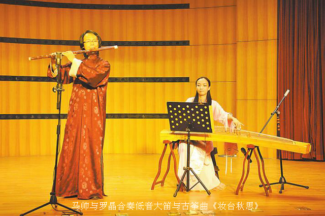 音乐会上,两位仅有6岁的小演奏者以一曲葫芦丝齐奏《我和你》拉开了音乐会的序幕,笛子独奏《扬鞭催马运粮忙》《京调》《春到湘江》和笛子齐奏《喜洋洋》《塔塔尔族舞曲》以及笛子二重奏《草原小姐妹》、巴乌独奏《灞柳情》那一曲曲饱满亮丽的音色,充分展现了似天籁的中国传统之声;笛子扬琴合奏《山歌》和民族管乐器合奏《故乡的原风景》同样以清雅悠扬的笛声和充盈厚实的气息给现场的观众留下了深刻的印象。我区民间文艺家协会的笛箫演奏者马帅为观众带来的箫独奏《关山月》和笛子独奏《帕米尔的春天》以及他的低音大笛与古筝合奏的《妆台秋思》更是赢得了场上此起彼伏的热烈掌声。最后,竹里馆少儿民族乐团的笛子合奏《金蛇狂舞》为音乐会奏出了一个圆满的终止线。