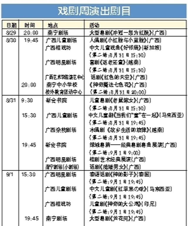 此外,广西戏剧院、南宁戏剧院、南宁艺术剧院有限责任公司、广西艺术学院等专业演艺团体也将轮番上阵,演出广西三大地方剧种——粤剧、桂剧、壮剧的精粹剧目,儿童粤剧《老鼠嫁女》、人偶剧《小红脸与小蓝脸》、话剧《隐婚男女》和《红色的天空》等。由南宁市民族文化艺术研究院精心打造,由梁素梅、黄俊成主演的新编大型历史粤剧《冲冠一怒为红颜》与《芦花河》两台大戏也将首次与观众见面。