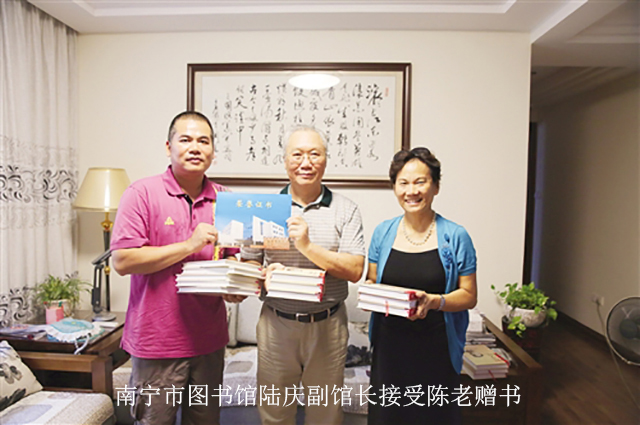 5日,在原南宁市文化新闻出版局局长陈晓玲女士的热心引见下,南宁市图书馆陆庆副馆长等一行来到南宁市原副市长陈中宁家中,接受陈老先生赠送的《陈枫画传》和《纪念陈枫》等2种10册珍贵的地方史料书籍的捐赠。
