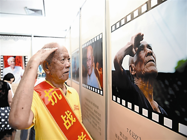 本报讯 8月15日,广西南宁举办为期一个月的“铭记历史·关爱抗战老兵”图片展。展览共展出40幅抗战老兵晚年个人影像,以及30幅记录“我与抗战老兵的故事”图片,真实再现了抗日英雄晚年的精神面貌。来自广西各地的70名抗战老兵以及他们的后代走进图片展现场,与广大市民共同回顾抗战烽烟历史。图为在广西南宁市图书馆,一名抗战老兵在参观“铭记历史·关爱抗战老兵”图片展。