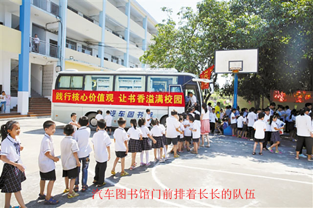 此次读书活动包括科学阅读挂图展,书画技巧现场指导,“书香进校园·快乐我阅读”有奖知识竞答,“践行核心价值观·让书香溢满校园”流动图书阅读活动等。虽然天气炎热,但仍吸引了众多学生参与,汽车图书馆门前排着长长的队伍,大家耐心地等待登上汽车图书馆选阅感兴趣的图书。