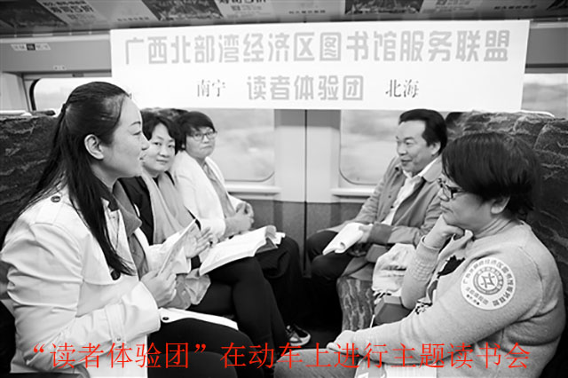 在动车上,“读者体验团”举办了一场“带着书本去旅行”主题读书会,嘉宾们热切交流,碰撞出许多思想的火花。杨建伟说,他喜欢阅读南宁本地文献和传统文化方面的书籍。传统文化需要的是传承,自己多年来在影视、戏剧方面不遗余力地推广本土文化,靠的正是阅读的不断积淀。明年,他将与南宁市图书馆合作开展“绿城讲坛”南宁本土文化的系列讲座。丘晓兰认为,一座城市的文化底蕴、文化高度需要市民的共同参与,更需要相关单位、部门和人员的共同努力,广西北部湾经济区图书馆服务联盟正是起到了这样的引领作用。南宁市图书馆长期以来也为爱读书的读者组织了许多针对热点、文学、时尚生活等方面的活动,希望有更多城市的读者能享受到这样的服务。主持人黄珂表示:“阅读是一架桥梁、一泓抚慰心灵的甘泉。两地17座图书馆的联合,正是为了让这样的桥梁或清泉尽可能地延伸到我们生活中的每一个角落,润泽每一颗需要灌溉的心灵。”