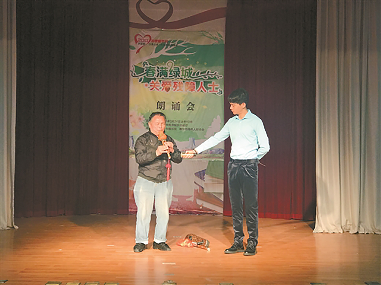 当天上午,志愿者们早早等在地铁口、公交车站旁等着迎接朗读者的到来,不少亲子家庭还备好了鲜花要送给每一位上台朗读的朋友。南宁市图书馆的活动负责人黄珂也告诉记者,他们策划该主题活动在“绿城舞台”上开展,是希望通过活动为残障人士提供展示自己的舞台,使大家更自信,对生活充满希望,同时也体现图书馆对特殊读者的关爱,以期达到“学雷锋·行善立德·志愿服务满绿城”志愿服务月的活动氛围与效果。表演者邱桂明登台为大家吹奏了一曲葫芦丝。悦耳动听的曲调结束后,邱桂明感慨地表示:“感谢活动主办方为我们提供这样的舞台。虽然我的眼睛看不见,但心里充满了阳光。”