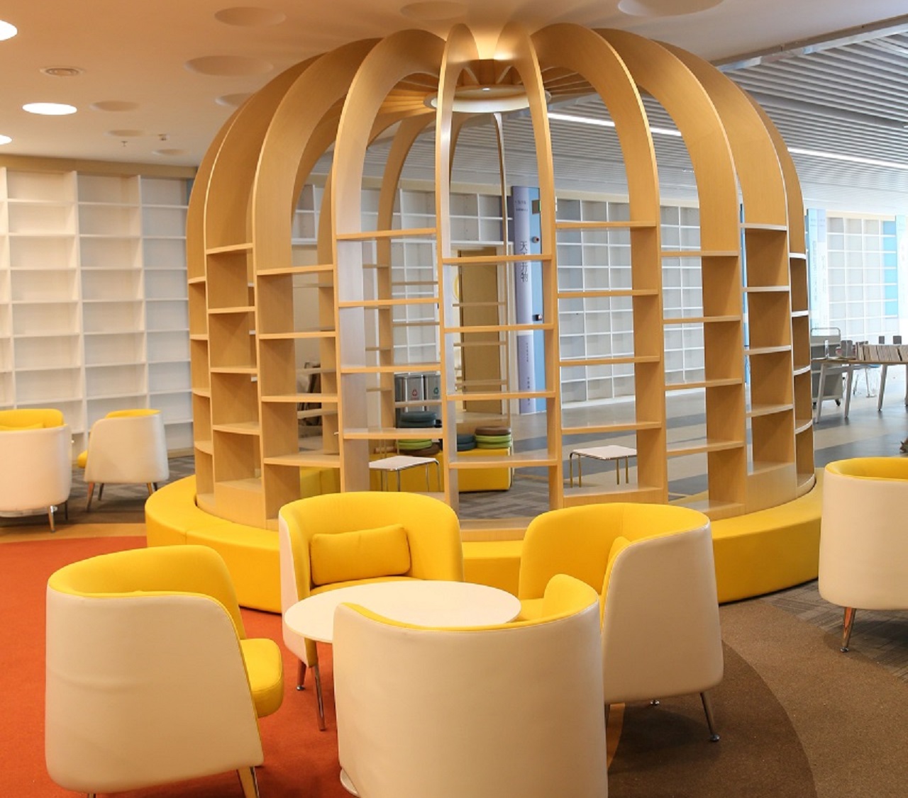 在楼层功能布局上,新馆设计藏书量200 万册,阅览坐席1700个,网络节点约3000个。其功能体系大致可分为外部读者服务和内部业务办公两大模块, 各区域保持相对独立又联系紧密。