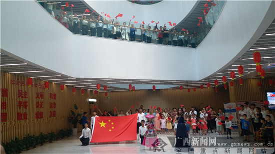 在活动现场,来自南宁市第十中学的绿城青少年为大家献声,朗诵诗歌《追梦中国》;小海螺童声合唱团献上童声合唱《红星歌》《同一首歌》两首歌曲,并放飞气球,预示着大家将同心共筑中国梦;两位著名的绿城文化名人杨泽民、黄矫艳在现场激情朗诵《青春中国》,赢得了阵阵掌声。随后,广大市民读者共同完成《我和我的祖国》“快闪”视频录制。从摆成“70”造型的学生队伍,到身着民族服装的小女孩现场献唱,再到小提琴的动情演奏,以及馆员们围成“心”的图案,表达对祖国的祝福。